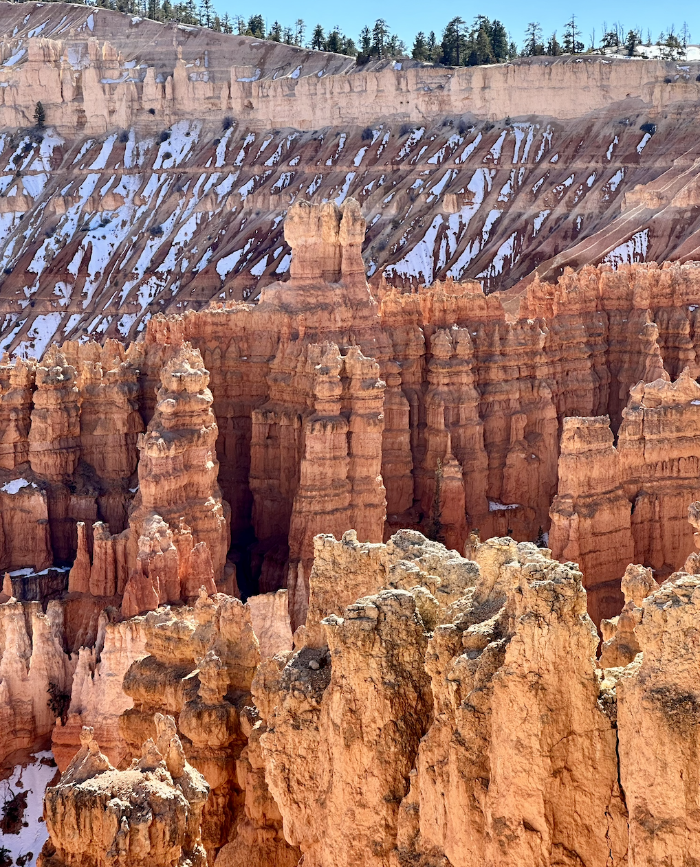 Bryce Canyon is famous for its hoodoos — tall, thin rock spires that fill the canyon amphitheater. The sheer number of these formations creates a landscape unlike anything else we had seen on the trip.